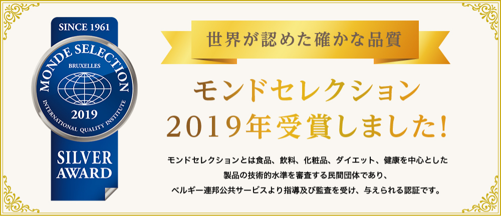 モンドセレクションは、⾷品・飲料・化粧品を中⼼とした製品の技術的⽔準を審査する⺠間団体 であり、ベルギー連邦公共サービスより指導及び監査を受け、与えられる認証です。